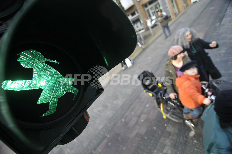 【3月17日 AFP】ドイツ西部ケルン(Cologne)で使用されている歩行者用信号の人型マーク「アンペルメンヒェン」(アンペルマン、ampelmaennchen)の少女版「Ampelmaedchen」(アンペルフロイ、Ampelfrau)。(c)AFP