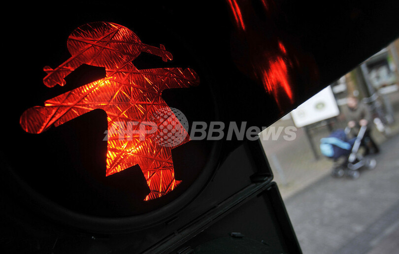 【3月17日 AFP】ドイツ西部ケルン(Cologne)で使用されている歩行者用信号の人型マーク「アンペルメンヒェン」(アンペルマン、ampelmaennchen)の少女版「Ampelmaedchen」(アンペルフロイ、Ampelfrau)。(c)AFP