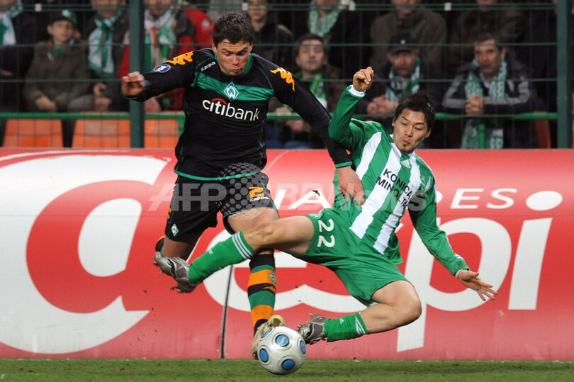スポーツ サッカー ヴェルダー・ブレーメンが準々決勝進出を決める 2009年3月19日 8:42 発信地:サンテティエンヌ/フランス [ ヨーロッパ フランス ] このニュースをシェア ‹ › ❮ 1/9 ❯ ヴェルダー・ブレーメンのゼバスティアン・ベニッシュ(%%Sebastian Boenisch%%)とボールを競るサンテティエンヌの松井大輔(%%Daisuke Matsui%%)。(2009年3月18日撮影)(c)AFP/PHILIPPE MERLE 画像作成中 ! 【3月19日 AFP】サッカーUEFA杯2008-09(UEFA Cup 2008-09)決勝トーナメント2回戦、サンテティエンヌ(AS Saint-Etienne)対ヴェルダー・ブレーメン(Werder Bremen)第2戦。試合は2-2の引き分けに終わり、2試合合計スコアを3-2としたヴェルダー・ブレーメンが準々決勝進出を決めた。(c)AFP サッカー 一覧へ> メディア・報道関係・法人の方向け 写真・動画 購入のお問合せ>