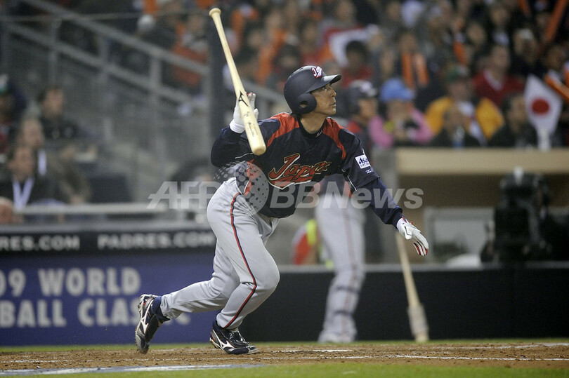 米大リーグ(MLB)シアトル・マリナーズ(Seattle Mariners)のイチロー(Ichiro Suzuki)は、2次ラウンドでは12打数無安打で内野を越えた打球がわずかに1つと悲惨な状況にあったが、第4打席で叩きつけた打球が一塁手の頭上を破りスランプを脱すると、9回には三塁打を放ち、青木の適時打で5点目の本塁を踏んだ。(c)AFP/Jim Slater