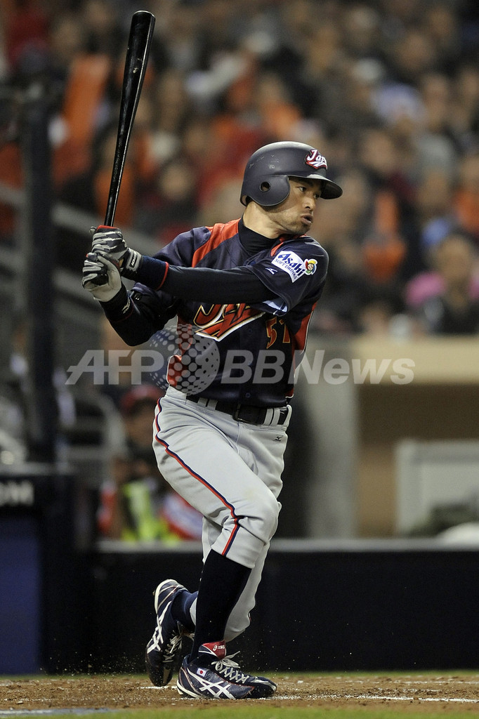 米大リーグ(MLB)シアトル・マリナーズ(Seattle Mariners)のイチロー(Ichiro Suzuki)は、2次ラウンドでは12打数無安打で内野を越えた打球がわずかに1つと悲惨な状況にあったが、第4打席で叩きつけた打球が一塁手の頭上を破りスランプを脱すると、9回には三塁打を放ち、青木の適時打で5点目の本塁を踏んだ。(c)AFP/Jim Slater