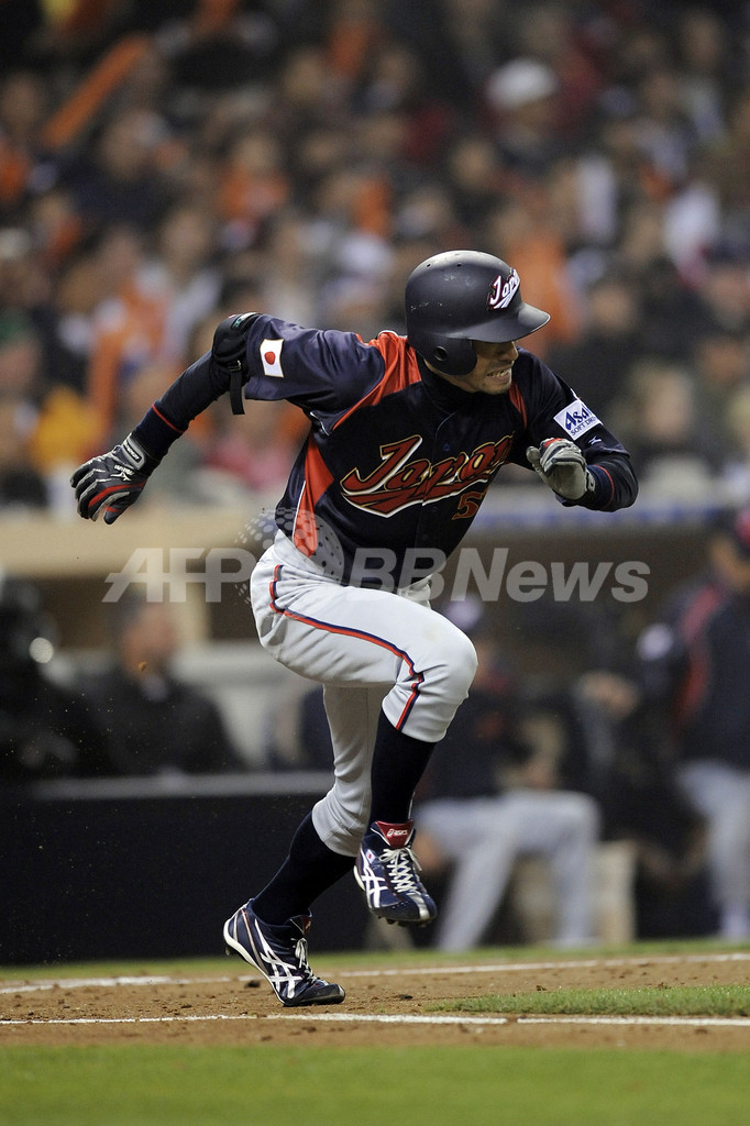 米大リーグ(MLB)シアトル・マリナーズ(Seattle Mariners)のイチロー(Ichiro Suzuki)は、2次ラウンドでは12打数無安打で内野を越えた打球がわずかに1つと悲惨な状況にあったが、第4打席で叩きつけた打球が一塁手の頭上を破りスランプを脱すると、9回には三塁打を放ち、青木の適時打で5点目の本塁を踏んだ。(c)AFP/Jim Slater