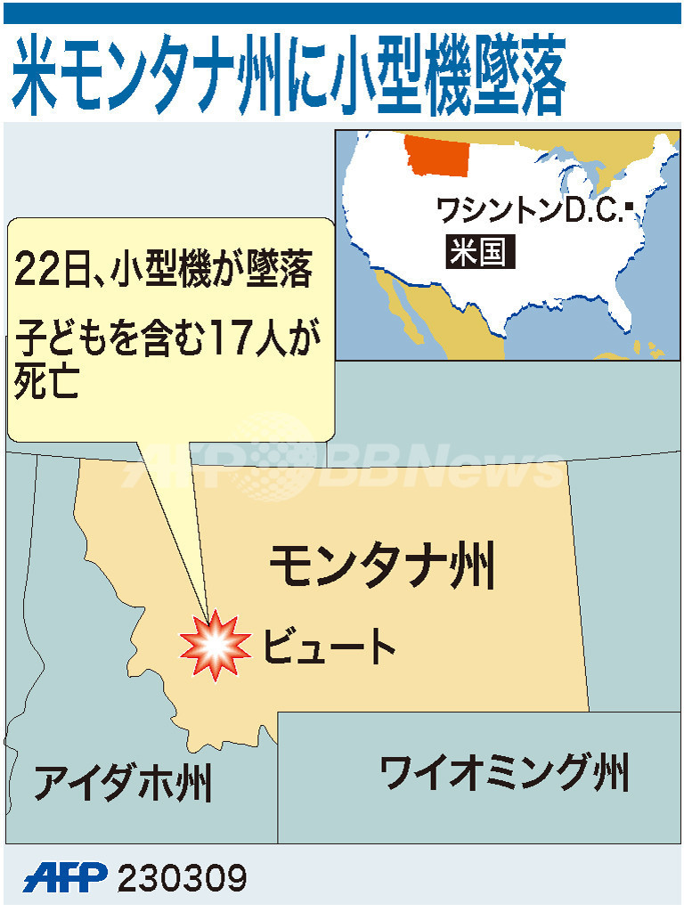ニュース 社会 図解 【図解】米モンタナ州で小型機墜落 2009年3月23日 12:38 発信地:米国 [ 北米 米国 ] このニュースをシェア (c)AFP 【3月23日 AFP】米モンタナ(Montana)州北部ビュート(Butte)で22日、小型機が墜落し、地元航空当局によると、乗っていた17人全員が死亡した。図は、墜落場所を示したもの。(c)AFP<ニュース解説画像一覧へ> 社会 一覧へ> メディア・報道関係・法人の方向け 写真・動画 購入のお問合せ>