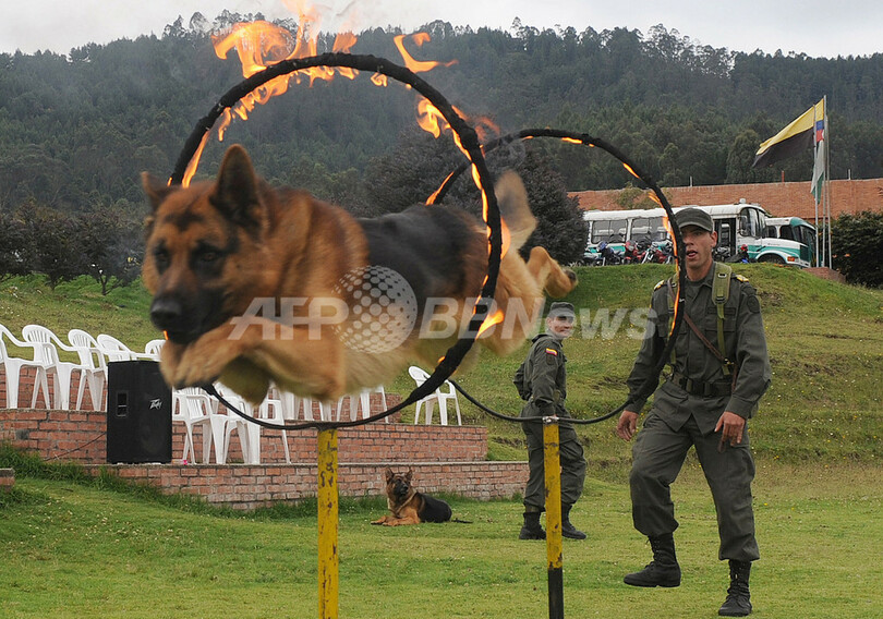 中南米の警察が合同で警察犬訓練、「炎の輪」をくぐる技も コロンビア