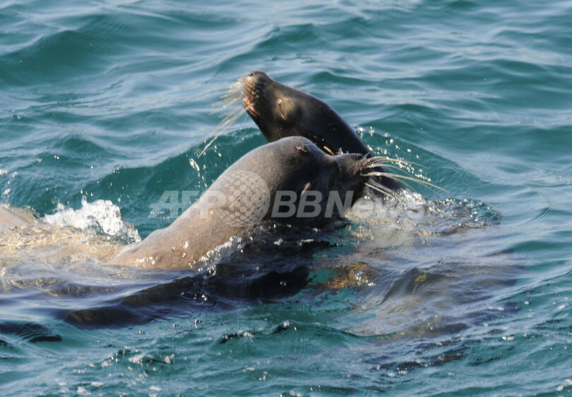 南米エクアドル・ガラパゴス諸島(Galapagos Archipelago)のセイモア島(Seymour Island)の海で、じゃれあうトドたち。本土から1000キロ沖の太平洋(Pacific Ocean)上にあるセイモア島は、多様な生物の宝庫として知られる(2009年3月17日撮影)。(c)AFP/Rodrigo BUENDIA