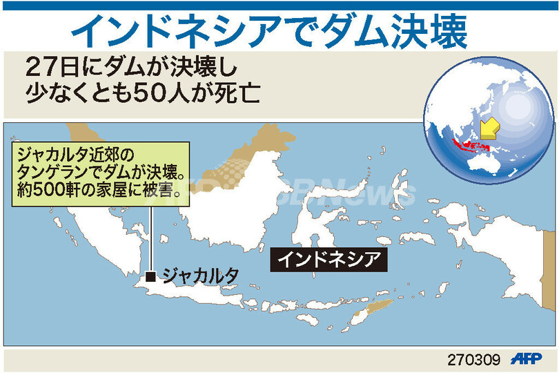 ニュース 社会 図解 【図解】インドネシアでダム決壊 2009年3月27日 15:57 発信地:ジャカルタ/インドネシア [ アジア・オセアニア インドネシア ] このニュースをシェア (c)AFP 【3月27日 AFP】インドネシアの首都ジャカルタ(Jakarta)近郊で27日午前2時(日本時間午前4時)ごろ、豪雨による増水でダムが決壊し、少なくとも50人が死亡、民家数百棟が浸水した。図は決壊したダムの位置を示す地図。(c)AFP<ニュース解説画像一覧へ> 社会 一覧へ> メディア・報道関係・法人の方向け 写真・動画 購入のお問合せ>