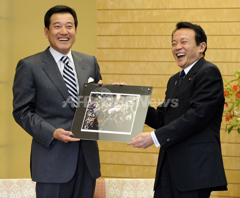 【3月27日 AFP】野球の第2回ワールド・ベースボール・クラシック(2009 World Baseball Classic、WBC)で2連覇を果たした日本代表チームの原辰徳(Tatsunori Hara)監督は27日、首相官邸を訪問し、麻生太郎(Taro Aso)首相に優勝を報告した。