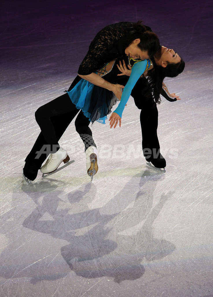 09世界フィギュアスケート選手権(%%ISU World Figure Skating Championships 2009%%)のエキシビションが29日、ロサンゼルス(Los Angeles)のステープルズ・センター(Staples Center)で行われた。写真は演技を披露するホウ清(%%Qing Pang%%、クィン・パン、右)とトウ健(%%Jian Tong%%、ジャン・トン)。(2009年3月29日撮影)(c)AFP/GABRIEL BOUYS