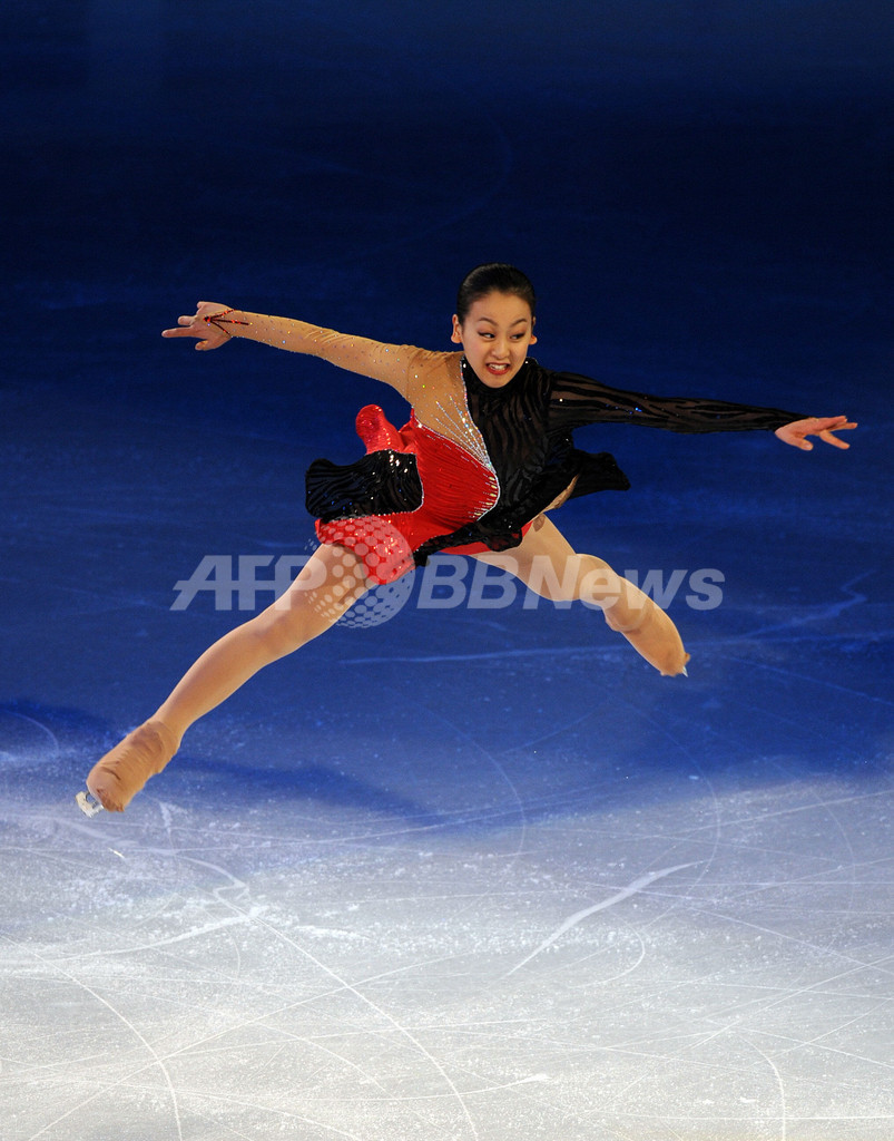 09世界フィギュアスケート選手権(%%ISU World Figure Skating Championships 2009%%)のエキシビションが29日、ロサンゼルス(Los Angeles)のステープルズ・センター(Staples Center)で行われた。写真は演技を披露する浅田真央(%%Mao Asada%%)。(2009年3月29日撮影)(c)AFP/GABRIEL BOUYS
