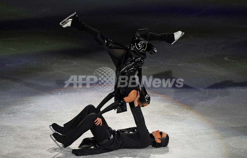 09世界フィギュアスケート選手権(%%ISU World Figure Skating Championships 2009%%)のエキシビションが29日、ロサンゼルス(Los Angeles)のステープルズ・センター(Staples Center)で行われた。写真は演技を披露するオクサナ・ドムニナ(%%Oksana Domnina%%、上)とマキシム・シャバリン(%%Maxim Shabalin%%)。(2009年3月29日撮影)(c)AFP/GABRIEL BOUYS