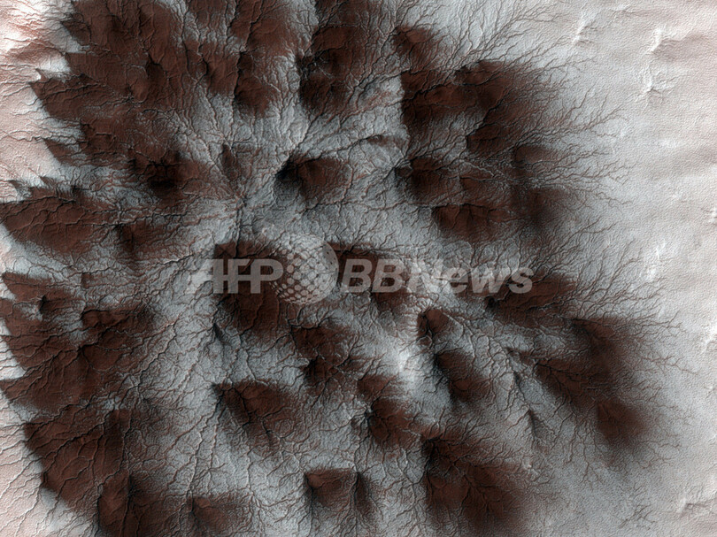 米航空宇宙局(NASA)の火星探査機「マーズ・リコネサンス・オービター(Mars Reconnaissance Orbiter、MRO)」が高解像度カメラ「HiRISE」で撮影した、火星の春季に昇華(個体が液体にならず直接気体になること)する二酸化炭素の「氷冠」と、その上にできた模様。この模様は地表から「氷冠」の裂け目に吹き上げたガスに舞い上げられたちりが堆積してできたと考えられている(2009年3月30日公開)。(c)AFP/NASA/JPL-Caltech/University of Arizona