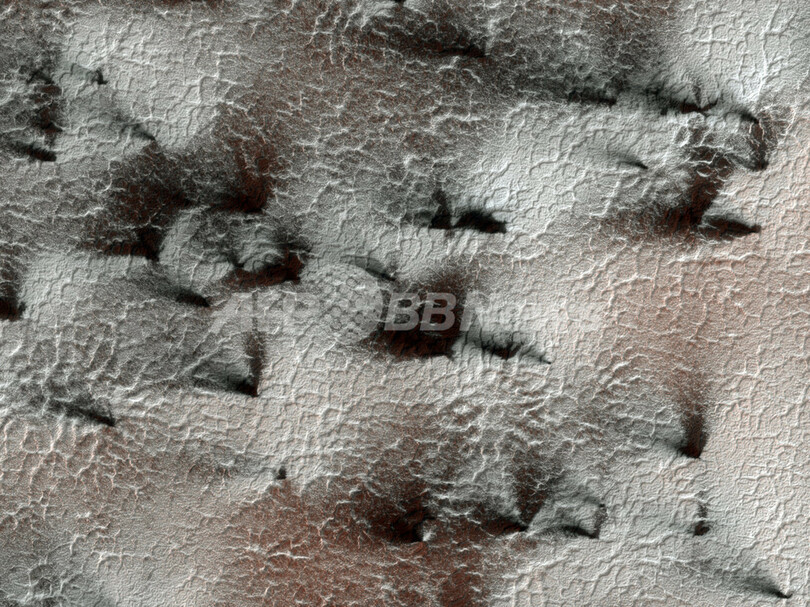米航空宇宙局(NASA)の火星探査機「マーズ・リコネサンス・オービター(Mars Reconnaissance Orbiter、MRO)」が高解像度カメラ「HiRISE」で撮影した、火星の春季に極地帯に二酸化炭素が凍結してできたドライアイスとその上にできた模様。この模様は地表から「氷冠」の裂け目に吹き上げたガスに舞い上げられたちりが堆積してできたと考えられている(2009年2月11日撮影、2009年3月30日公開)。(c)AFP/NASA/JPL-Caltech/University of Arizona
