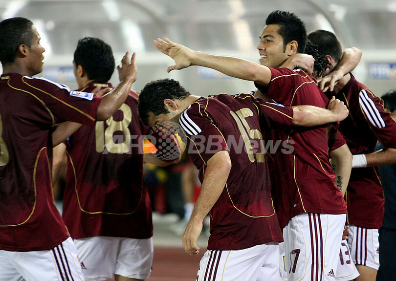 スポーツ サッカー ベネズエラ ホームでコロンビア下す、W杯予選 2009年4月1日 15:32 発信地:プエルト・オルダス/ベネズエラ [ 中南米 ベネズエラ ] このニュースをシェア ‹ › ❮ 6/10 ❯ 2010年サッカーW杯南アフリカ大会(%%2010 World Cup%%)南米予選第12節、ベネズエラ対コロンビア。試合はベネズエラが2-0でコロンビアを下した。写真は、後半32分に先制ゴールを決め、チームメイトと歓喜するベネズエラのミクー(%%Nicolas Ladislao Fedor Flores "Miku"%%、右2)。(2009年3月31日撮影)(c)AFP/THOMAS COEX 画像作成中 ! 【4月1日 AFP】2010年サッカーW杯南アフリカ大会(2010 World Cup)南米予選第12節、ベネズエラ対コロンビア。試合はベネズエラが2-0でコロンビアを下した。(c)AFP サッカー 一覧へ> メディア・報道関係・法人の方向け 写真・動画 購入のお問合せ>