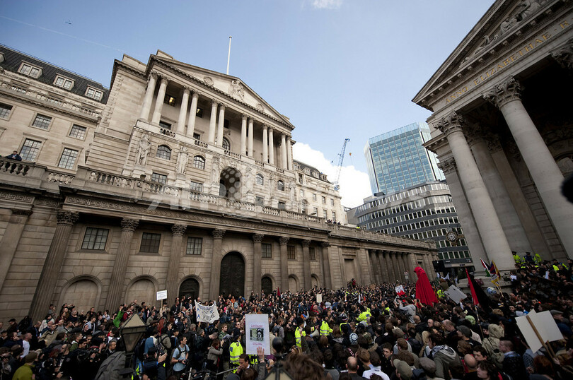 また、英中央銀行のイングランド銀行(Bank of England)前でも、デモ隊と警官隊が小競り合いとなっている。