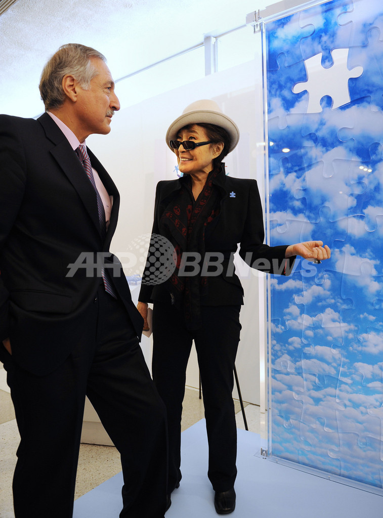 UN)本部で、壁画風の作品を発表した。作品のタイトルは「Promise(約束)」で、高さ約2メートル、67ピースのジグソーパズルになっている。各ピースにはオノさんのサインが入っており、うち2個が自閉症の治療活動促進のシンボルとして保存され、残りは自閉症の啓発活動を行う基金への支援金とするため競売に掛けられる。(c)AFP