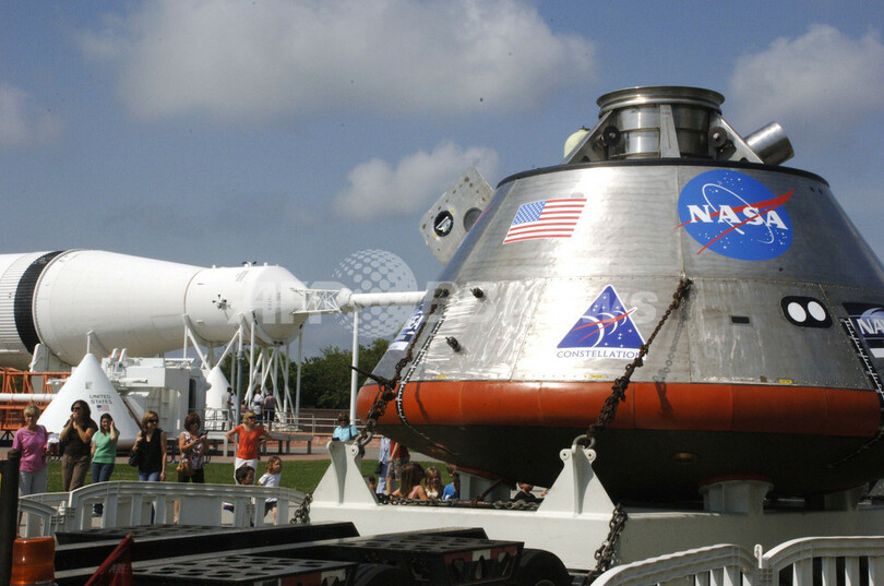 米フロリダ(Florida)州にあるケネディ宇宙センター(Kennedy Space Center)内のロケットガーデン(Rocket Garden)で、公開中の米航空宇宙局(NASA)の新型有人宇宙船「オリオン(Orion)」の実物大模型を見学する人びと。NASAは同地で次週、「オリオン」実物大模型の着水試験などを実施する。(2009年4月2日撮影)。(c)AFP/RUCE WEAVER