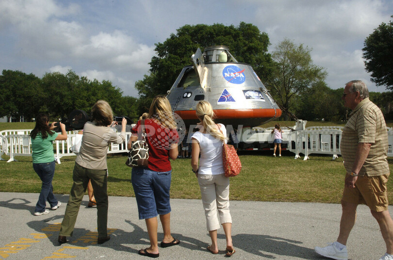 米フロリダ(Florida)州にあるケネディ宇宙センター(Kennedy Space Center)内のロケットガーデン(Rocket Garden)で、公開中の米航空宇宙局(NASA)の新型有人宇宙船「オリオン(Orion)」の実物大模型を見学する人びと。NASAは同地で次週、「オリオン」実物大模型の着水試験などを実施する。(2009年4月2日撮影)。(c)AFP/RUCE WEAVER