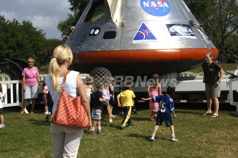 米フロリダ(Florida)州にあるケネディ宇宙センター(Kennedy Space Center)内のロケットガーデン(Rocket Garden)で、公開中の米航空宇宙局(NASA)の新型有人宇宙船「オリオン(Orion)」の実物大模型を見学する子どもたち。NASAは同地で次週、「オリオン」実物大模型の着水試験などを実施する。(2009年4月2日撮影)。(c)AFP/RUCE WEAVER