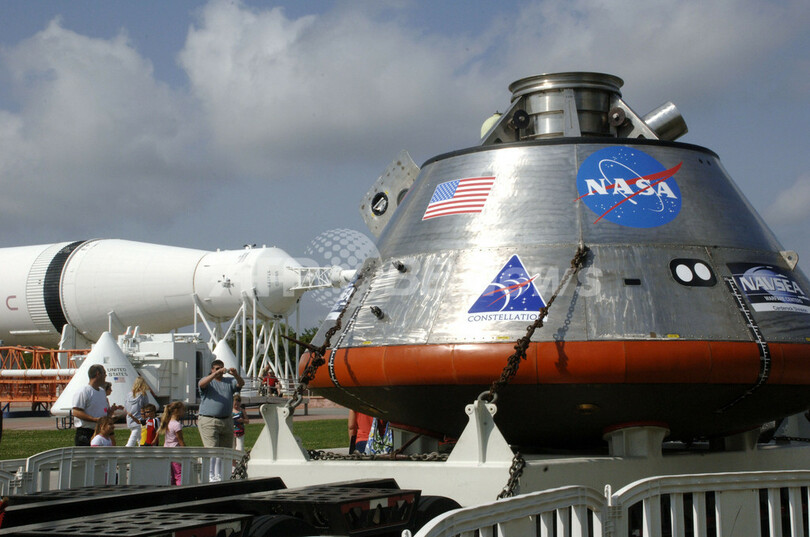 【4月3日 AFP】米フロリダ(Florida)州にあるケネディ宇宙センター(Kennedy Space Center)内のロケットガーデン(Rocket Garden)で公開された米航空宇宙局(NASA)の新型有人宇宙船「オリオン(Orion)」の実物大模型。NASAは同地で次週、「オリオン」実物大模型の着水試験などを実施する予定。(2009年4月2日撮影)。(c)AFP