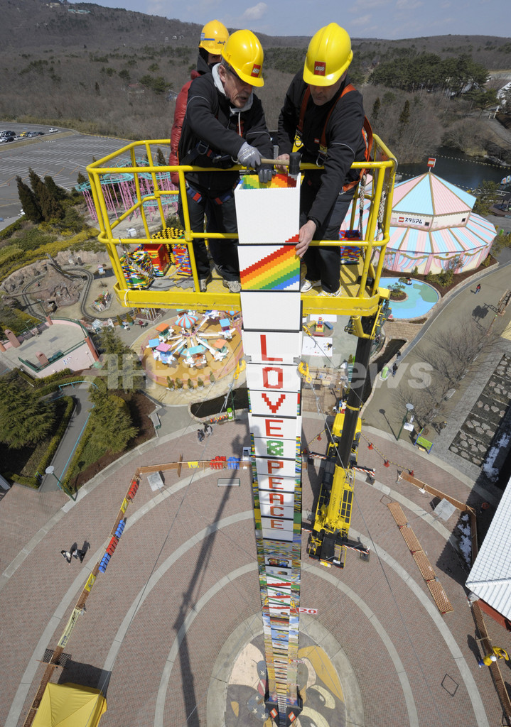 【4月3日 AFP】栃木県の那須ハイランドパークで3日、レゴブロックで作った塔の世界記録への挑戦が行われ、高さ29.70メートルの世界一高いレゴブロックの塔が建てられた。