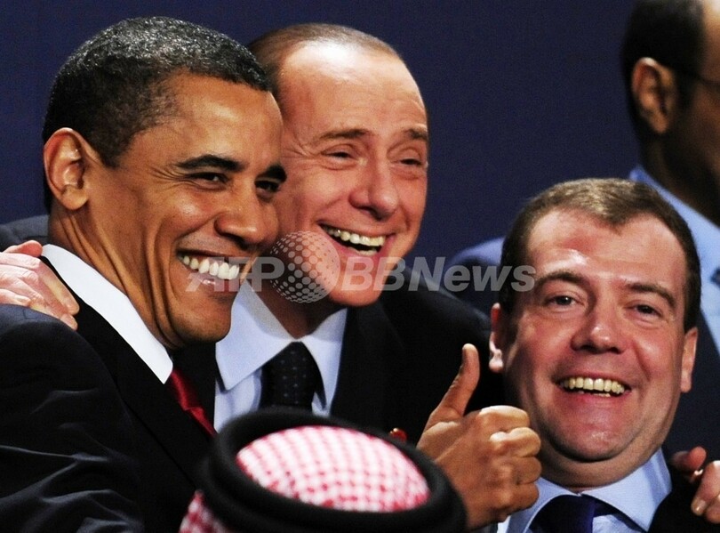 なお、金融サミット参加国首脳・関係者が2日撮影した集合写真には、オバマ大統領とドミトリー・メドベージェフ(Dmitry Medvedev)露大統領の間で満面の笑みを浮かべたベルルスコーニ首相が写っている。(c)AFP