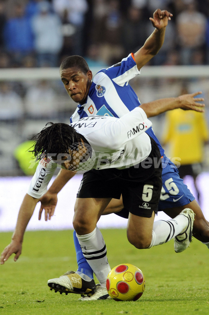 08-09ポルトガル1部リーグ第23節、ビトリア・ギマラエス(%%Vitoria Guimaraes%%)対FCポルト(%%FC Porto%%)。試合はポルトが3-1で勝利した。写真はFCポルトのフェルナンド(%%Fernando Francisco Reges%%)とボールを競り合うビトリア・ギマラエスのクストディオ・カストロ(%%Custodio Castro%%)。(2009年4月4日撮影)(c)AFP/FERNANDO VELUDO