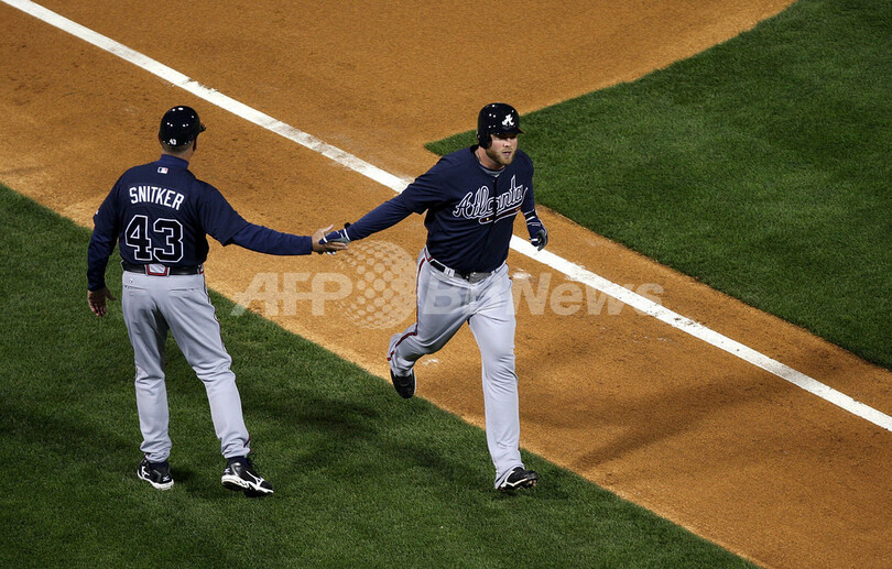 ブレーブスはロサンゼルス・ドジャース(Los Angeles Dodgers)から移籍し4年契約を結んだデレク・ロウ(Derek Lowe)が先発し、8回を投げて2安打無失点4奪三振に抑える好投を見せると、打線はブライアン・マッカン(Brian McCann)が2点本塁打、ジェフ・フランコーア(Jeff Francoeur)とジョーダン・シェーファー(Jordan Schafer)がソロ本塁打と、フィリーズの先発ブレット・マイヤーズ(Brett Myers)から計3本塁打を放った。(c)AFP