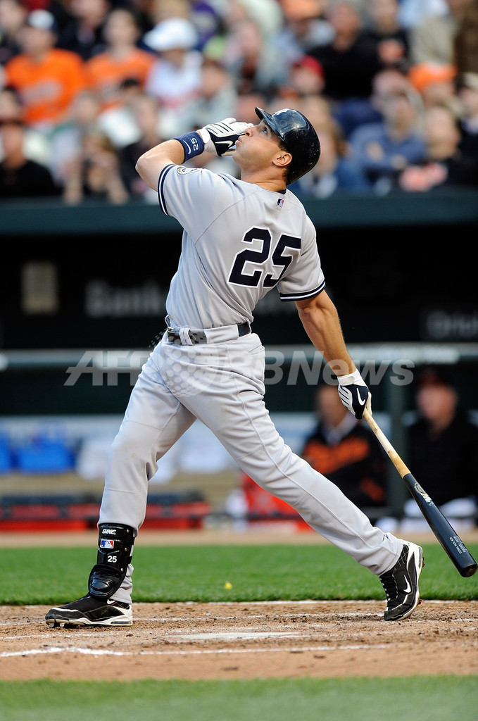 【4月7日 AFP】(写真追加)09MLB、ニューヨーク・ヤンキース(New York Yankees)の松井秀喜(Hideki Matsui)は6日、ボルティモア・オリオールズ(Baltimore Orioles)戦に4番・指名打者(DH)で先発出場し、7回表に右中間へ2点本塁打を放ち、5打数1安打2打点を記録した。試合はヤンキースが5-10でオリオールズに敗れ、シーズン開幕戦を勝利で飾ることはできなかった。(c)AFP