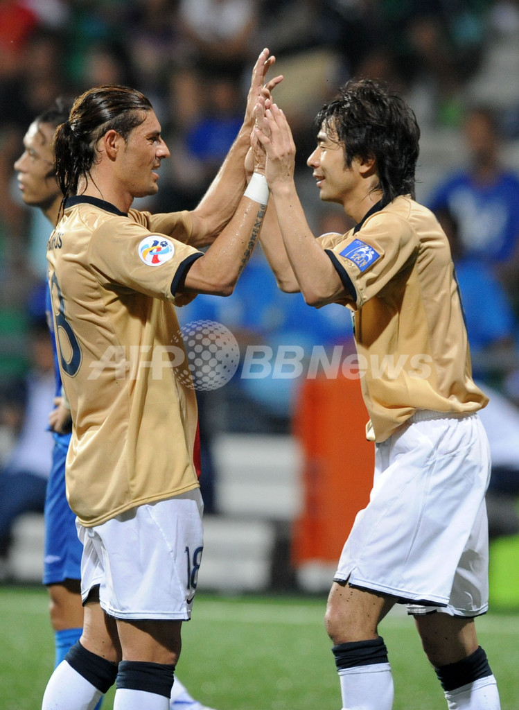サッカーAFCチャンピオンズリーグ2009(%%AFC Champions League 2009%%)1次リーグG組、シンガポール・アームド・フォース(%%Singapore Armed Forces%%)対鹿島アントラーズ(%%Kashima Antlers%%)。試合は鹿島アントラーズが4-1で快勝した。写真は先制点を挙げてチームメイトのマルキーニョス(%%Marcos Gomes De Araujo 'Marquinhos'%%)と喜びを分かち合う鹿島アントラーズの本山雅志(%%Motoyama Masashi%%)。(2009年4月7日撮影)(c)AFP/ROSLAN RAHMAN