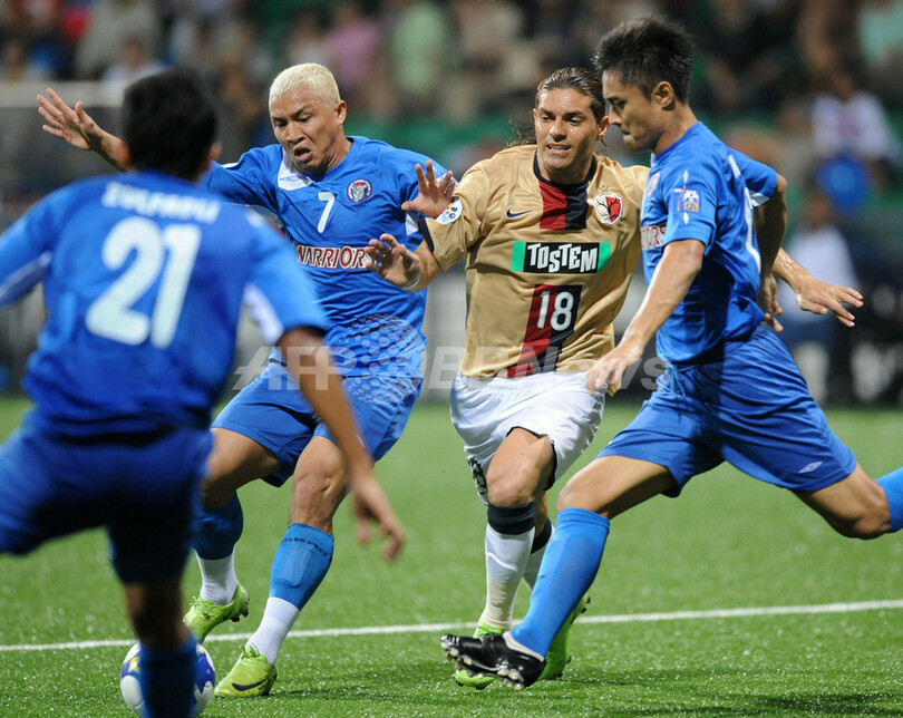 サッカーAFCチャンピオンズリーグ2009(%%AFC Champions League 2009%%)1次リーグG組、シンガポール・アームド・フォース(%%Singapore Armed Forces%%)対鹿島アントラーズ(%%Kashima Antlers%%)。試合は鹿島アントラーズが4-1で快勝した。写真はディフェンスに囲まれる鹿島アントラーズのマルキーニョス(%%Marcos Gomes De Araujo 'Marquinhos'%%、右2)。(2009年4月7日撮影)(c)AFP/ROSLAN RAHMAN