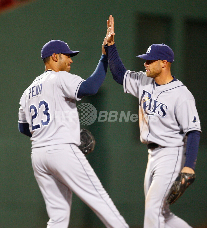 スポーツ 野球 岩村 レッドソックス戦で3安打3得点、レイズは初勝利 2009年4月9日 12:00 発信地:ボストン/米国 [ 北米 米国 ] このニュースをシェア ‹ › ❮ 3/17 ❯ 09MLB、ボストン・レッドソックス(%%Boston Red Sox%%)対タンパベイ・レイズ(%%Tampa Bay Rays%%)。試合はレイズが7-2で勝利し、開幕2戦目でシーズン初勝利を飾った。写真は試合後にハイタッチを交わすタンパベイ・レイズのカルロス・ペナ(%%Carlos Pena%%、左)とゲーブ・キャプラー(%%Gabe Kapler%%)。(2009年4月8日撮影)(c)AFP/Getty Images/Jim Rogash 画像作成中 ! 【4月8日 AFP】09MLB、タンパベイ・レイズ(Tampa Bay Rays)の岩村明憲(Akinori Iwamura)は8日、ボストン・レッドソックス(Boston Red Sox)戦に9番・二塁で先発出場し、4打数3安打3得点を記録した。試合はレイズが7-2で勝利し、開幕2戦目でシーズン初勝利を飾った。(c)AFP 野球 一覧へ> メディア・報道関係・法人の方向け 写真・動画 購入のお問合せ>