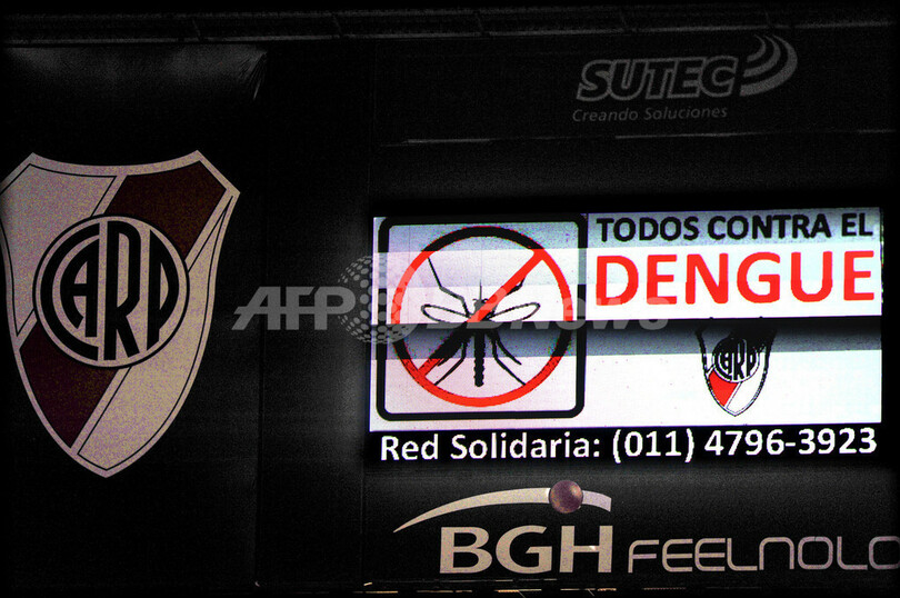 写真は、ブエノスアイレス(Buenos Aires)にあるサッカースタジアム「Monumental」に掲げられた、ネッタイシマカの駆除を呼びかける電光掲示板。(2009年4月7日撮影)。(c)AFP/DANIEL GARCIA