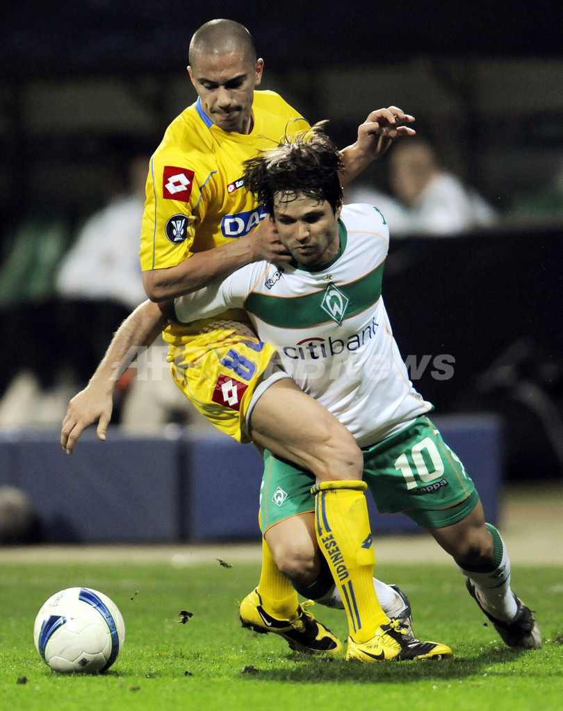 サッカーUEFA杯2008-09(%%UEFA Cup 2008-09%%)準々決勝、ヴェルダー・ブレーメン(%%Werder Bremen%%)対ウディネーゼ(%%Udinese%%)第1戦。試合はヴェルダー・ブレーメンが3-1でウディネーゼに快勝した。写真はウディネーゼのギョクハン・インレル(%%Gokhan Inler%%)とボールを競るヴェルダー・ブレーメンのジエゴ・リバス(%%Diego Ribas%%)。(2009年4月9日撮影)(c)AFP/DDP/DAVID HECKER