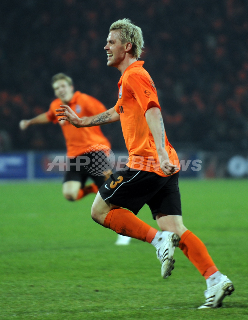 サッカーUEFA杯2008-09(%%UEFA Cup 2008-09%%)準々決勝、シャフタール・ドネツク(%%Shakhtar Donetsk%%)対オリンピック・マルセイユ(%%Olympique de Marseille%%)第1戦。試合はシャフタール・ドネツクが2-0でマルセイユに快勝した。写真は前半39分に先制点を挙げて歓喜するシャフタール・ドネツクのトマシュ・ヒュブシュマン(%%Tomas Hubschman%%)。(2009年4月9日撮影)(c)AFP/SERGEI SUPINSKY