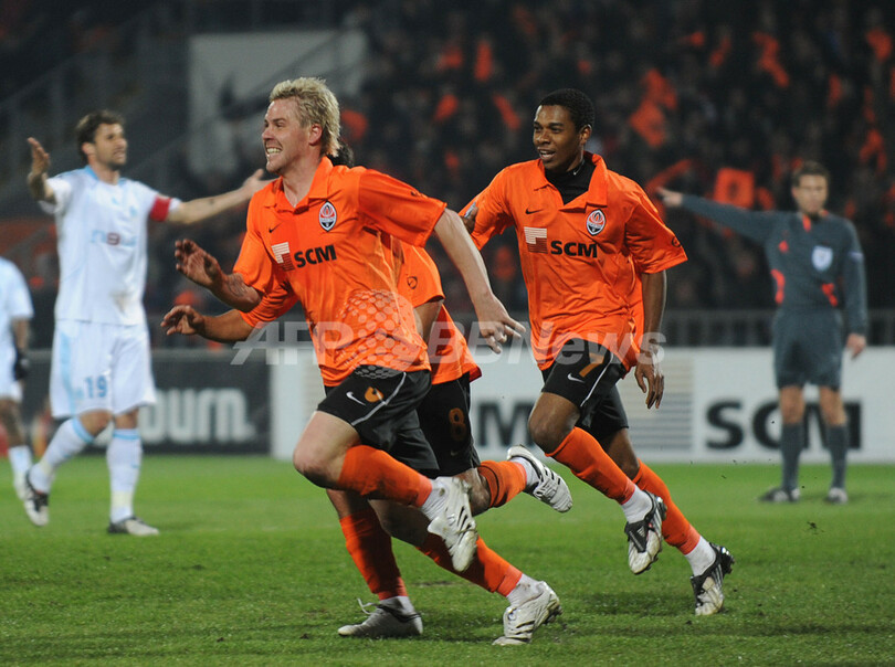 サッカーUEFA杯2008-09(%%UEFA Cup 2008-09%%)準々決勝、シャフタール・ドネツク(%%Shakhtar Donetsk%%)対オリンピック・マルセイユ(%%Olympique de Marseille%%)第1戦。試合はシャフタール・ドネツクが2-0でマルセイユに快勝した。写真は前半39分に先制点を挙げて歓喜するシャフタール・ドネツクのトマシュ・ヒュブシュマン(%%Tomas Hubschman%%)。(2009年4月9日撮影)(c)AFP/SERGEI SUPINSKY