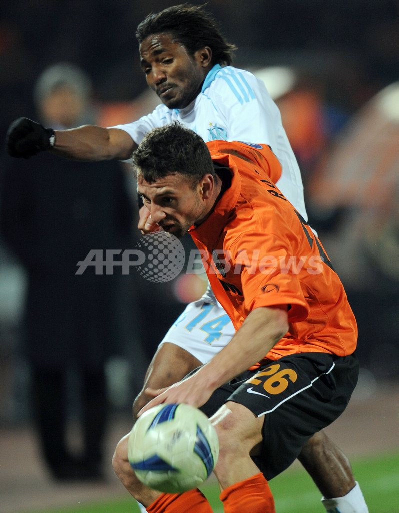 サッカーUEFA杯2008-09(%%UEFA Cup 2008-09%%)準々決勝、シャフタール・ドネツク(%%Shakhtar Donetsk%%)対オリンピック・マルセイユ(%%Olympique de Marseille%%)第1戦。試合はシャフタール・ドネツクが2-0でマルセイユに快勝した。写真はオリンピック・マルセイユのバカリ・コーネ(%%Baky Kone%%)とボールを競るシャフタール・ドネツクのラズバン・ラツ(%%Razvan Rat%%)。(2009年4月9日撮影)(c)AFP/SERGEI SUPINSKY