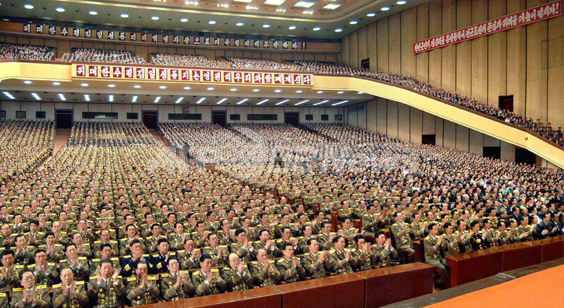 北朝鮮のTV放送を監視している聯合ニュースによると、金総書記は演台まで10歩ほどを進んだ際には、軽く左足をひきずっていたが、拍手の際には両手を挙げたという。(c)AFP/Park Chan-Kyong