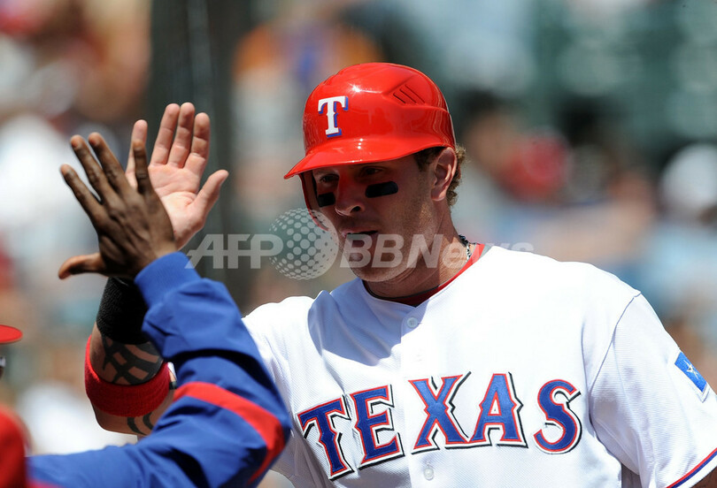 09MLB、テキサス・レンジャーズ(%%Texas Rangers%%)対クリーブランド・インディアンス(%%Cleveland Indians%%)。試合はレンジャーズが12-8でインディアンスを下した。写真は2回に得点を挙げ、チームメイトとハイタッチを交わすテキサス・レンジャーズのジョシュ・ハミルトン(%%Josh Hamilton%%)。(2009年4月9日撮影)(c)AFP/Getty Images/Ronald Martinez