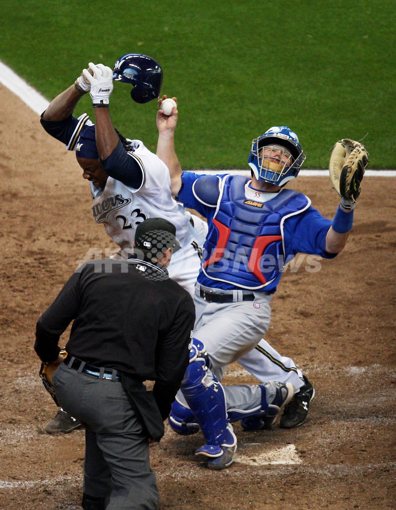09MLB、ミルウォーキー・ブルワーズ(%%Milwaukee Brewers%%)対シカゴ・カブス(%%Chicago Cubs%%)。試合はブルワーズが4-3でサヨナラ勝ちを収めた。写真は9回にサヨナラのホームを踏むブルワーズのリッキー・ウィークス(%%Rickie Weeks%%、左)。(2009年4月10日撮影)(c)AFP/Getty Images/Jonathan Daniel