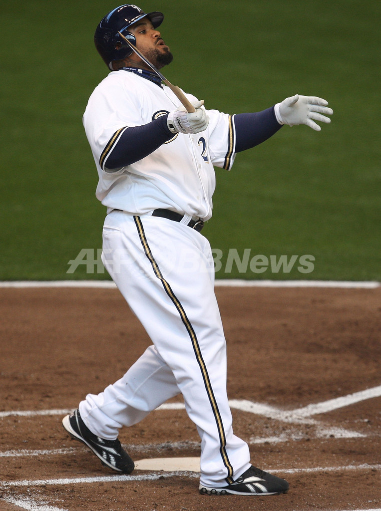 09MLB、ミルウォーキー・ブルワーズ(%%Milwaukee Brewers%%)対シカゴ・カブス(%%Chicago Cubs%%)。試合はブルワーズが4-3でサヨナラ勝ちを収めた。写真はバットを折られたブルワーズのプリンス・フィールダー(%%Prince Fielder%%)。(2009年4月10日撮影)(c)AFP/Getty Images/Jonathan Daniel