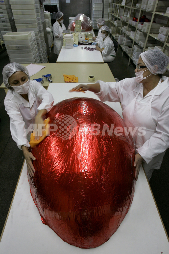 イエス・キリストの復活を祝うキリスト教の宗教行事「復活祭(Easter、イースター)」を祝う巨大なイースターエッグが、ブラジルのサンパウロ(Sao Paulo)のチョコレート工場で9日、製造された。イースターエッグは外殻が厚さ6センチのチョコレートでつくられ、重さ165キログラム、高さはなんと1.2メートル。中にはチョコレート菓子が詰め込まれている。製造された4つのイースターエッグのうち、2つは寄付され、残りの2つは1万4743レアル(約68万円)で販売された。写真は、巨大イースターエッグを包装する従業員ら(2009年4月9日撮影)。(c)AFP/Mauricio LIMA