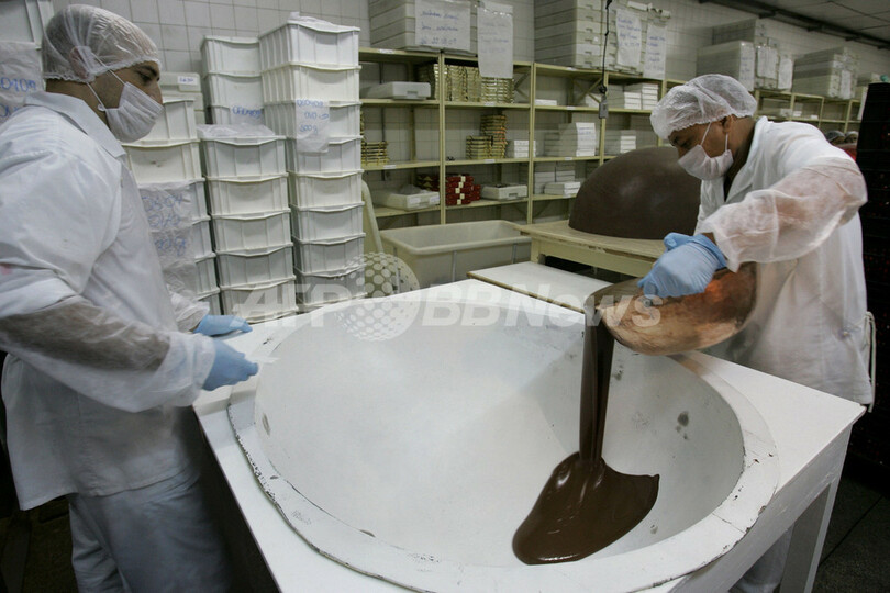 イエス・キリストの復活を祝うキリスト教の宗教行事「復活祭(Easter、イースター)」を祝う巨大なイースターエッグが、ブラジルのサンパウロ(Sao Paulo)のチョコレート工場で9日、製造された。イースターエッグは外殻が厚さ6センチのチョコレートでつくられ、重さ165キログラム、高さはなんと1.2メートル。中にはチョコレート菓子が詰め込まれている。製造された4つのイースターエッグのうち、2つは寄付され、残りの2つは1万4743レアル(約68万円)で販売された。写真は、たまごの型にチョコレートを流し込む従業員(2009年4月9日撮影)。(c)AFP/Mauricio LIMA