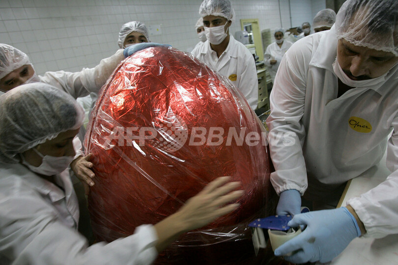 イエス・キリストの復活を祝うキリスト教の宗教行事「復活祭(Easter、イースター)」を祝う巨大なイースターエッグが、ブラジルのサンパウロ(Sao Paulo)のチョコレート工場で9日、製造された。イースターエッグは外殻が厚さ6センチのチョコレートでつくられ、重さ165キログラム、高さはなんと1.2メートル。中にはチョコレート菓子が詰め込まれている。製造された4つのイースターエッグのうち、2つは寄付され、残りの2つは1万4743レアル(約68万円)で販売された。写真は、巨大イースターエッグを包装する従業員ら(2009年4月9日撮影)。(c)AFP/Mauricio LIMA
