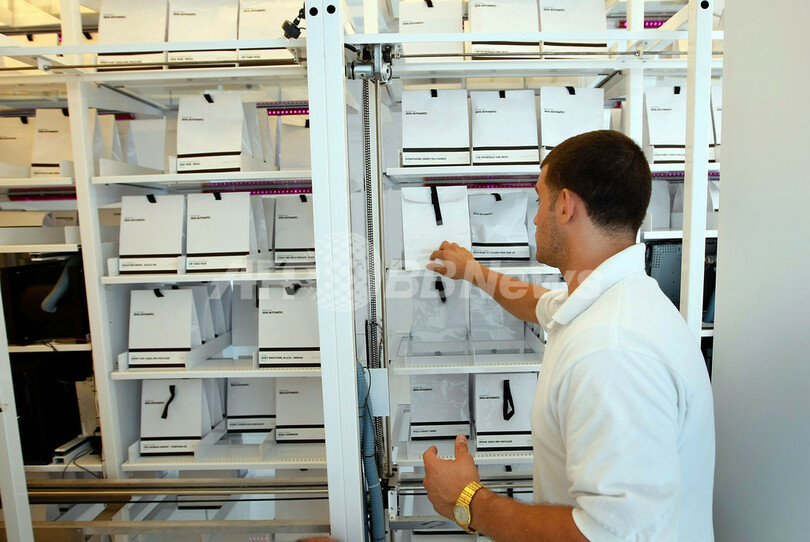 この半自動の販売機では、ヨット旅行やペントハウスの高級マンション、英国の高級車「ベントレー(Bentley)」なども購入することができる。クレジットカード払いで、歯ブラシやサングラスは扉を開けて商品を受け取る。ドイツ高級車BMWのオートバイなどは、商品の交換券の入った袋が出てくる仕組み。写真は、自動販売機に商品を補充する従業員(2009年4月10日撮影)。(c)AFP/Getty Images/Joe Raedle