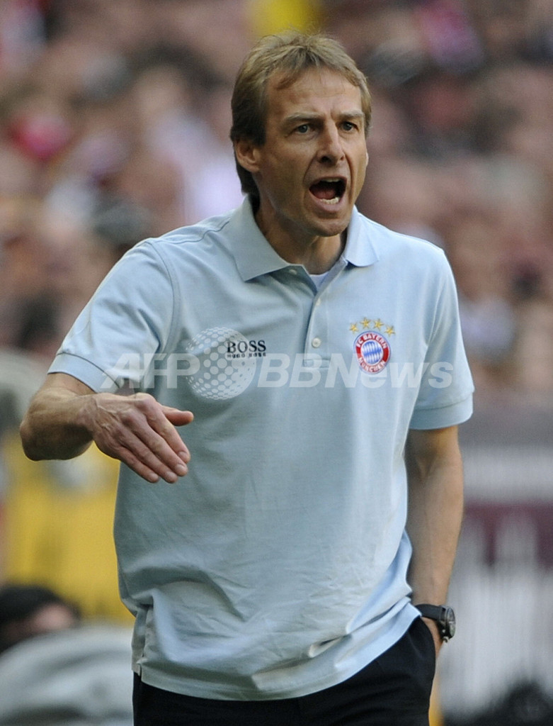 08-09ドイツ・ブンデスリーガ1部第27節、バイエルン・ミュンヘン(%%Bayern Munich%%)対フランクフルト(%%Eintracht Frankfurt%%)。試合はバイエルンが4-0で快勝した。写真は選手に指示を出すバイエルン・ミュンヘンのユルゲン・クリンスマン(%%Juergen Klinsmann%%)監督。(2009年4月11日撮影)(c)AFP/DDP/LENNART PREISS