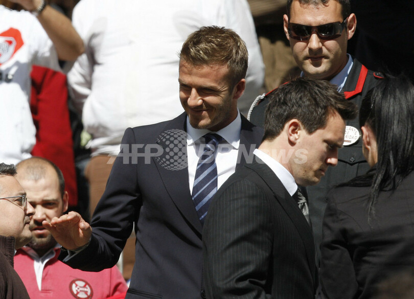 08-09スペイン1部リーグ第30節、レアル・マドリード(%%Real Madrid%%)対レアル・バジャドリード(%%Real Valladolid%%)。試合はレアル・マドリードが2-0で勝利し、4連勝で首位FCバルセロナ(%%FC Barcelona%%)との勝ち点差を再び6とした。写真は試合観戦に訪れた、かつてレアル・マドリードに所属し現在はイタリア・セリエAのACミラン(%%AC Milan%%)に所属するデビッド・ベッカム(%%David Beckham%%)。(2009年4月12日撮影)(c)AFP/DANI POZO