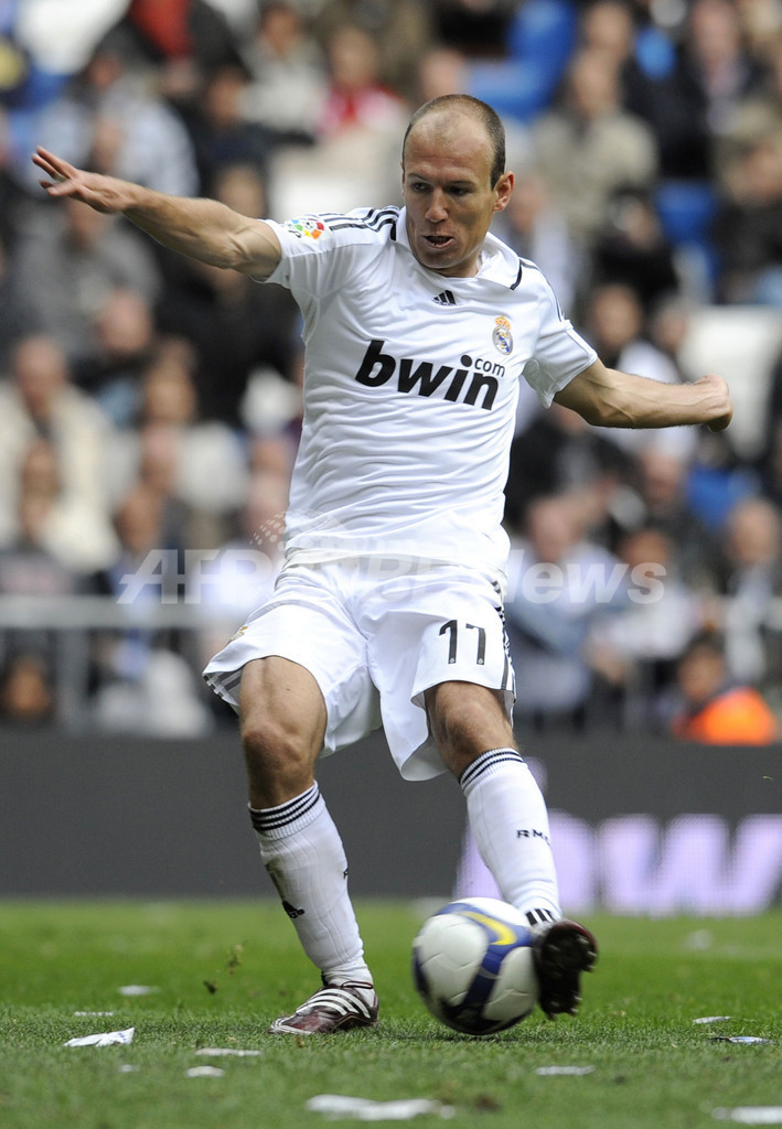 08-09スペイン1部リーグ第30節、レアル・マドリード(%%Real Madrid%%)対レアル・バジャドリード(%%Real Valladolid%%)。試合はレアル・マドリードが2-0で勝利し、4連勝で首位FCバルセロナ(%%FC Barcelona%%)との勝ち点差を再び6とした。写真は後半36分にチームの2点目を決めるレアル・マドリードのアリエン・ロッベン(%%Arjen Robben%%)。(2009年4月12日撮影)(c)AFP/DANI POZO