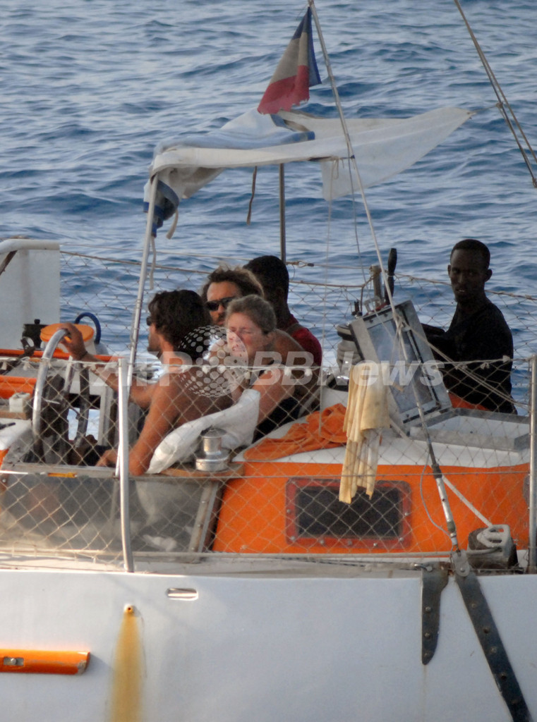 【4月13日 AFP】ソマリア沖のアデン湾(Gulf of Aden)でフランスのヨット「Tanit」号が海賊に乗っ取られた事件で、仏海軍の特殊部隊が10日決行した人質救出作戦の様子。人質5人のうち3歳の子どもを含む4人を救出したが、ヨットの所有者の男性1人が死亡した。海賊は2人が射殺され、3人が拘束された。(c)AFP