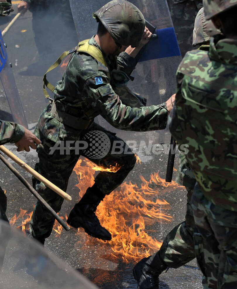 【4月13日 AFP】(写真追加)タイの首都バンコク(Bangkok)で政府に抗議を続けているタクシン・シナワット(Thaksin Shinawatra)元首相派のデモは13日も激化し、火炎瓶を投げ込まれた教育省の関連庁舎1棟が炎上した。