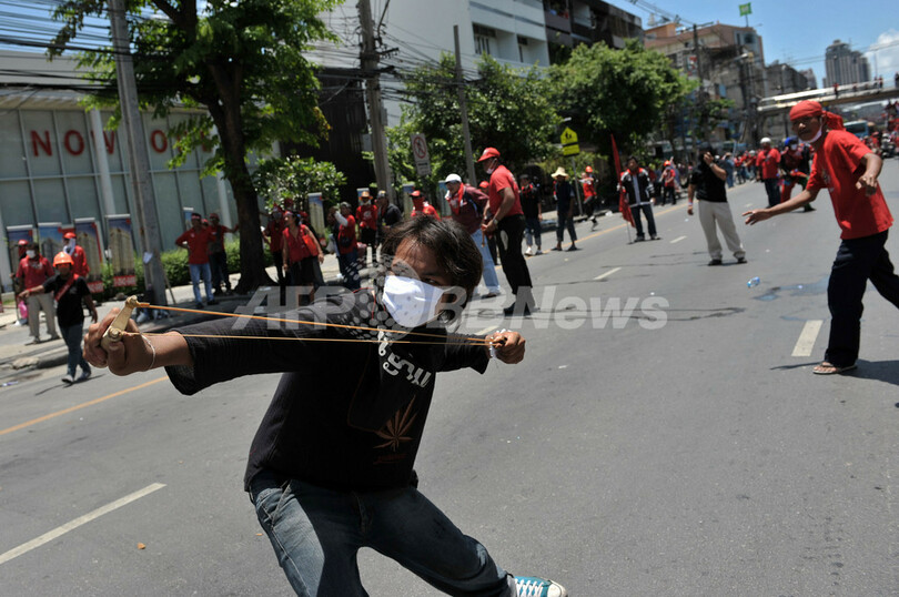 【4月13日 AFP】(写真追加)タイの首都バンコク(Bangkok)で政府に抗議を続けているタクシン・シナワット(Thaksin Shinawatra)元首相派のデモは13日も激化し、火炎瓶を投げ込まれた教育省の関連庁舎1棟が炎上した。